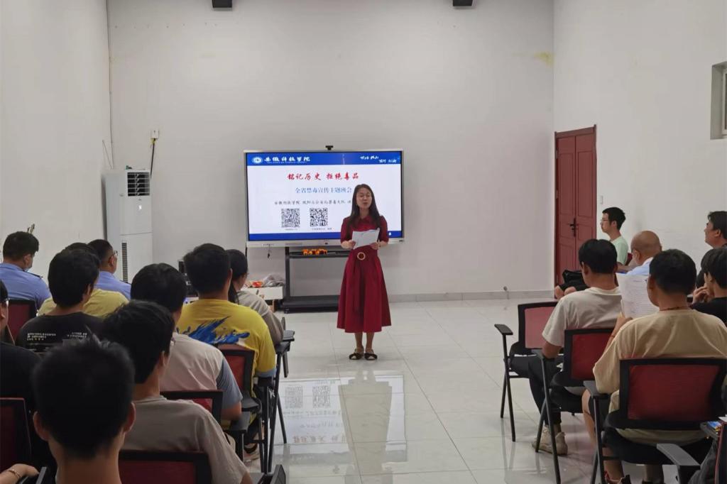 首先,凤阳县禁毒大队教导员为同学们讲述召开此次主题班会背景、毒品的危害、我国毒品斗争历史等。随后播放了禁毒宣传公益短片《青春不是挥霍的筹码》《别让“我以为”变成“我后悔”》以及短视频《无孔不入的第三代毒品》《逝去的幸福》,向同学们全面普及毒品危害知识。最后大家集中观看了省禁毒委、团省委相关负责人致辞寄语视频,同学们备受鼓舞,齐唱禁毒歌曲《生命》,并现场发起禁毒倡议,深入宣传,根植“珍爱生命 远离毒品”“健康人生 绿色无毒”理念。