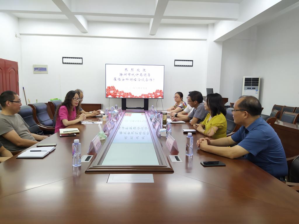 8月19日,滁州市统计局城市调查队队长周奋兵一行来乐鱼平台_乐鱼(中国)一站式服务平台财经学院洽谈合作,学院副院长郝世绵、金怀玉,国际经济与贸易系主任李强博士,经管综合实验中心主任李宝礼博士等出席洽谈会。