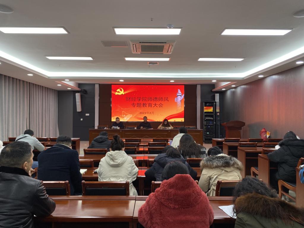 为进一步严明纪律规矩,深化师德师风建设,2月24日上午,财经学院在龙湖校区西辅楼111会议室召开2023年师德师风专题教育大会。学院党委书记杜小明,党委副书记、院长郝世绵出席会议。全体教职工参加会议。