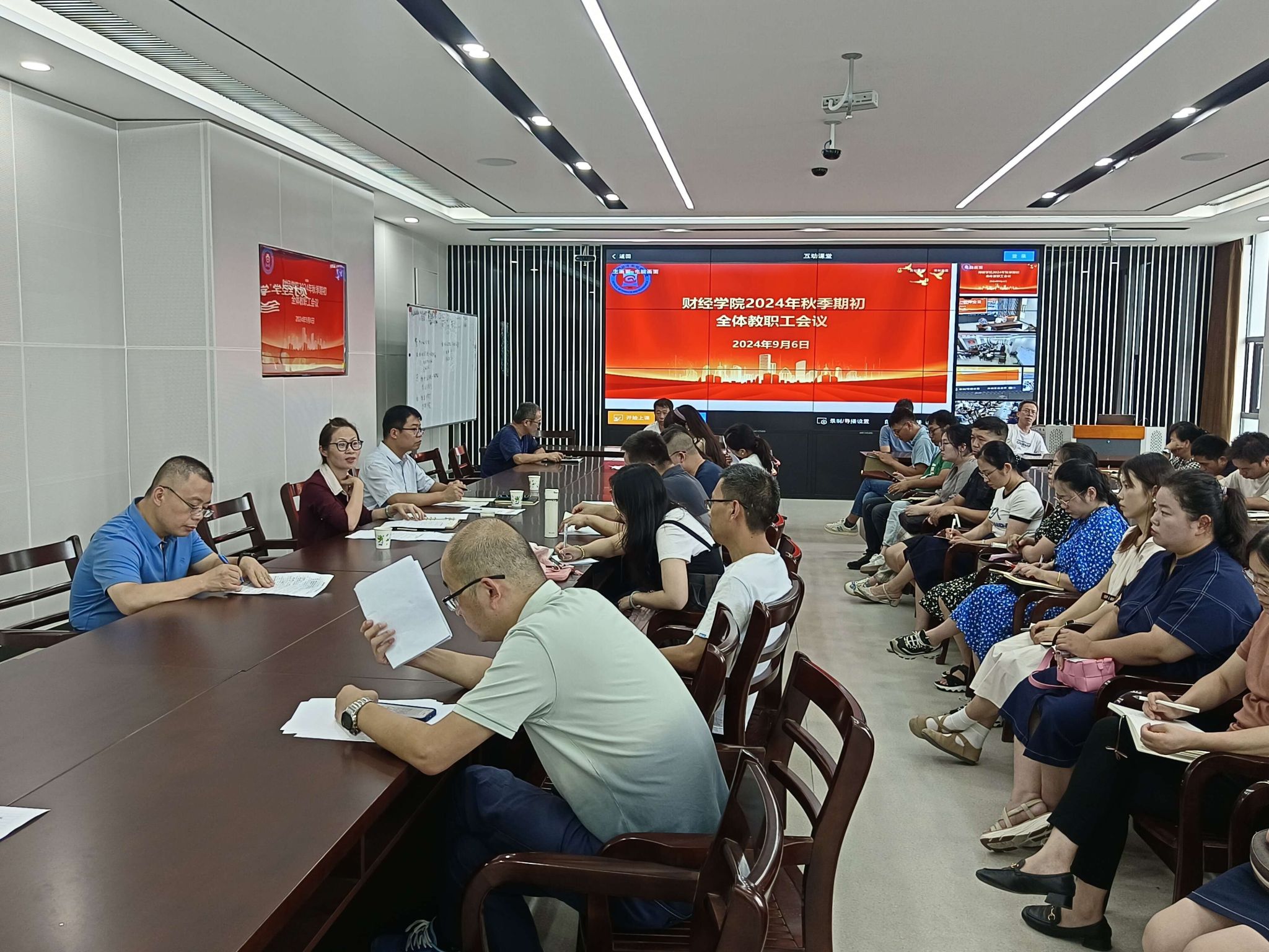 9月6日下午,财经学院在敏行楼C302虚拟教研室召开全体教职工会议。学院党政领导班子和全体教职工参加会议,会议由学院党委书记杜小明主持。