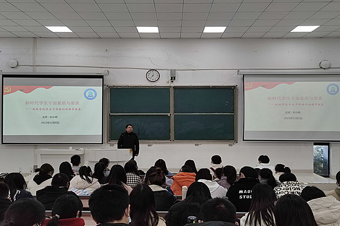 为引导学生干部尽快适应角色,提升工作认知和责任担当,12月6日中午,财经学院团委在龙湖校区致知楼C111教室组织“新时代学生干部素质与要求”主题团课,学院党委书记杜小明应邀作培训辅导。主题团课由团委书记薛枫主持,学院各团学组织负责人和2022级新生团学干部参加培训。