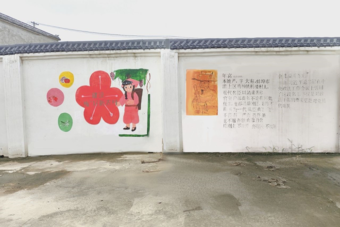 为更好地宣传梅楼村,志愿者在设计墙绘时深入走访当地村干部和村民,听取历史故事,翻看宣传册等,深入了解乡村的历史渊源和人文风情,并将这些元素有机融入到作品中。壁画内容丰富多样,有新颖的梅桥镇人物形象“梅姑娘”,也有梅桥和杨楼村的特色蔬菜水果。同学们顶着炎炎烈日,挥洒汗水和热情,构图、调色、上色、刻画,有条不紊,认真勾勒每一个细节,每一幅壁画都是一幅文化的传承,一幅富有情感的作品。在绘画过程中,志愿者不仅注重绘画技巧的运用,也着力将艺术融入乡村生活。