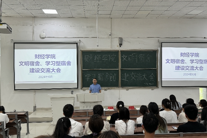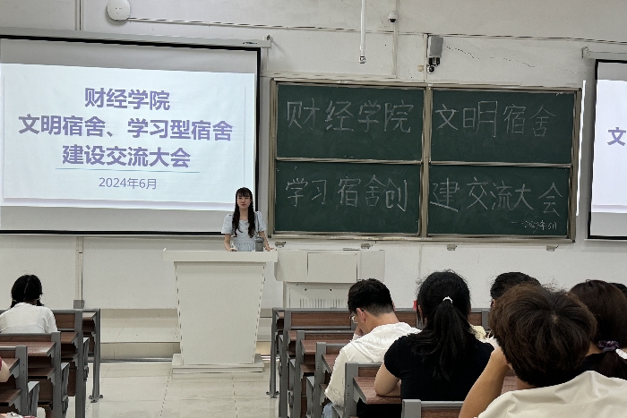 为进一步全面做好学生宿舍管理工作,规范学生宿舍管理内容,不断提升“三全”育人质量,扎实推进寝室文明建设,6月12日,财经学院在致知楼A111召开文明宿舍、学习型宿舍创建交流大会。学院党委副书记耿广汉、团委书记薛枫、辅导员丁雨妍出席,学院全体生活委员、2023级寝室长参会。