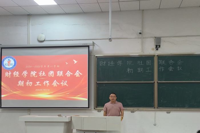 为加强社团建设管理,推动新学期学生社团各项工作有序开展,9月11日,财经学院在致知楼A111召开新学期社团工作会议。学院党委副书记、纪委书记耿广汉出席,社团联合会指导老师陆文斌及社联各部门、各协会主要负责人参加会议。会议由学院社团联合会主席张航主持。