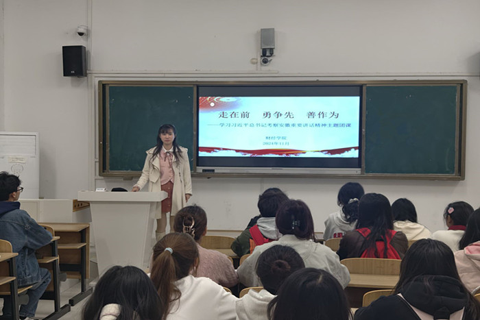 此次团课以“走在前勇争先善作为”为主题。薛枫带领参会人员深入学习习近平总书记考察安徽重要讲话精神,通过视频了解安徽各地在科技创新、文化传承、社会治理等方面的积极探索和实践成果,让学员们直观感受到了习近平总书记重要讲话精神在安徽大地的生动实践。她希望与会学生干部一是要秉持报国理想,勇担责任使命,绘好“走在前”的青春底色;二要立足自身岗位,奋发进取当表率,树立“勇争先”的担当品质;三要立大志、明大德、成大才、担大任,敢想敢为善作善成,培养“善作为”的优良作风。