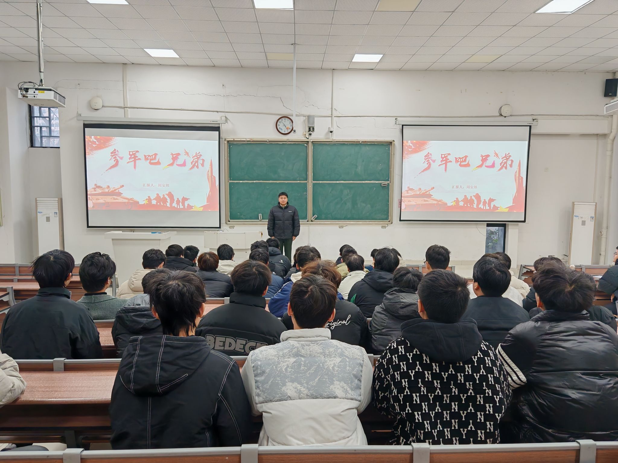 主题班会凝聚共识,厚植家国情怀。12月1日-10日,全院各班级“淬火青春 砺剑报国”为主题召开班会。辅导员通过播放应征入伍宣传片、解读最新政策文件、组织讨论交流等形式,引导学生深刻认识参军入伍对个人成长和国家发展的重要意义。