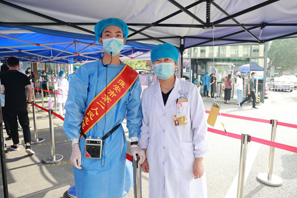 自7月21日起,因扬州、南京等地区局部出现多例新冠确诊病例,临近两地的淮安市疫情防控压力激增,大量市民前往市二院做核酸检测。从在市二院门诊检验科工作的母亲口中得知医院面向全院招募志愿者的消息后,干怿涵主动请缨,递交申请,和母亲一同奋战在市二院抗疫一线。