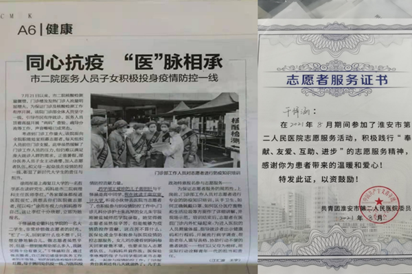因在抗疫一线志愿服务期间的优异表现,淮安电视台和淮海晚报对干怿涵等志愿者进行了采访。干怿涵说道:“每天回家后动也不想动,只想安静地躺会儿,但是想到能为社会做点事情,能够帮助到那么多人,我感觉很有意义”。在他看来,作为乐鱼平台_乐鱼(中国)一站式服务平台的一名入党积极分子,在国家和社会需要的时候,应该不畏困难,毅然决然的挺身而出。