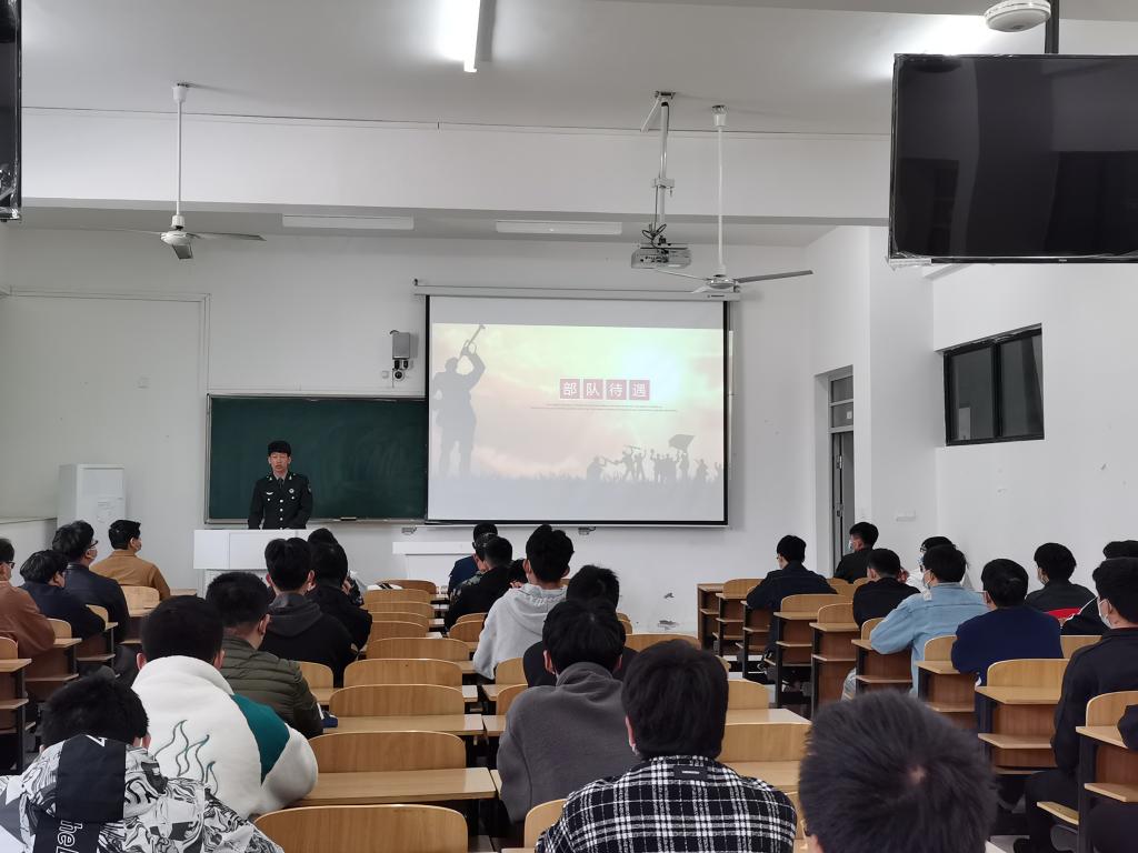 四位退役大学生着装齐整、逐一宣讲。他们生动详细讲述了部队的日常训练、军旅的业余生活、大学生当兵的优待政策、参军入伍的主要流程、退伍后的发展空间。他们声情并茂的讲解,图片并茂的展示,矫健挺拔的身姿,赢得听众的阵阵掌声和啧啧赞叹。闻兵老师介绍了学校大学生征兵的整体情况,并和与会学生进行交流互动。