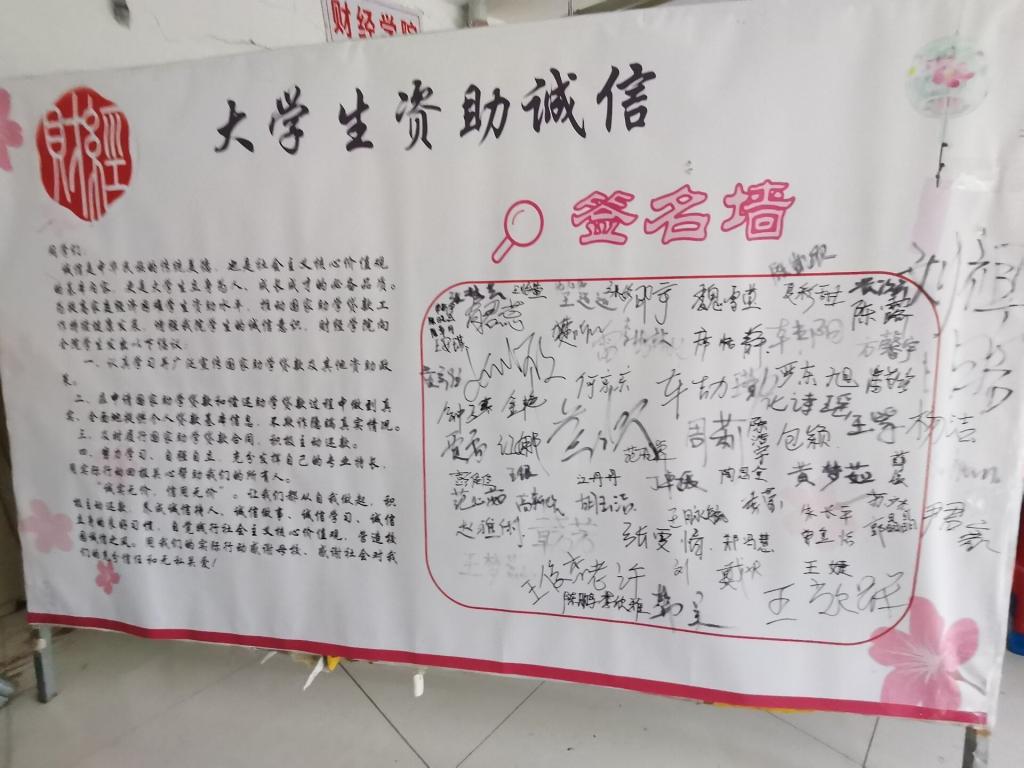 为深入宣传贯彻国家资助政策,强化资助育人效果,培育和践行社会主义核心价值观,财经学院5月8日至5月31日组织开展了“诚立身,信立德,学立志”学生资助诚信主题系列教育活动。辅导员积极组织,学生踊跃参加,取得良好活动效果。