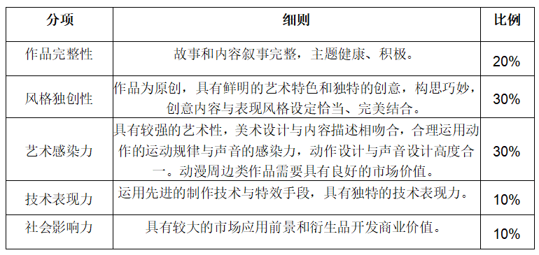 竞赛原则上按照各参赛作品类别(动画、插画、动漫周边、游戏美术)省赛参赛人数的5%、15%、30%、40%设立一、二、三等奖及优秀奖。
