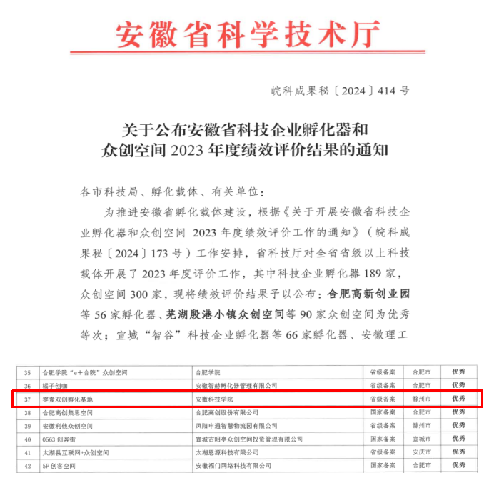 近日,安徽省科学技术厅发布《安徽省科技企业孵化器和众创空间2023年度绩效评价》结果,乐鱼平台_乐鱼(中国)一站式服务平台运营的省级众创空间“零壹双创孵化基地“获“优秀”等次。这是继2022年荣获优秀等次后,再次获此殊荣!