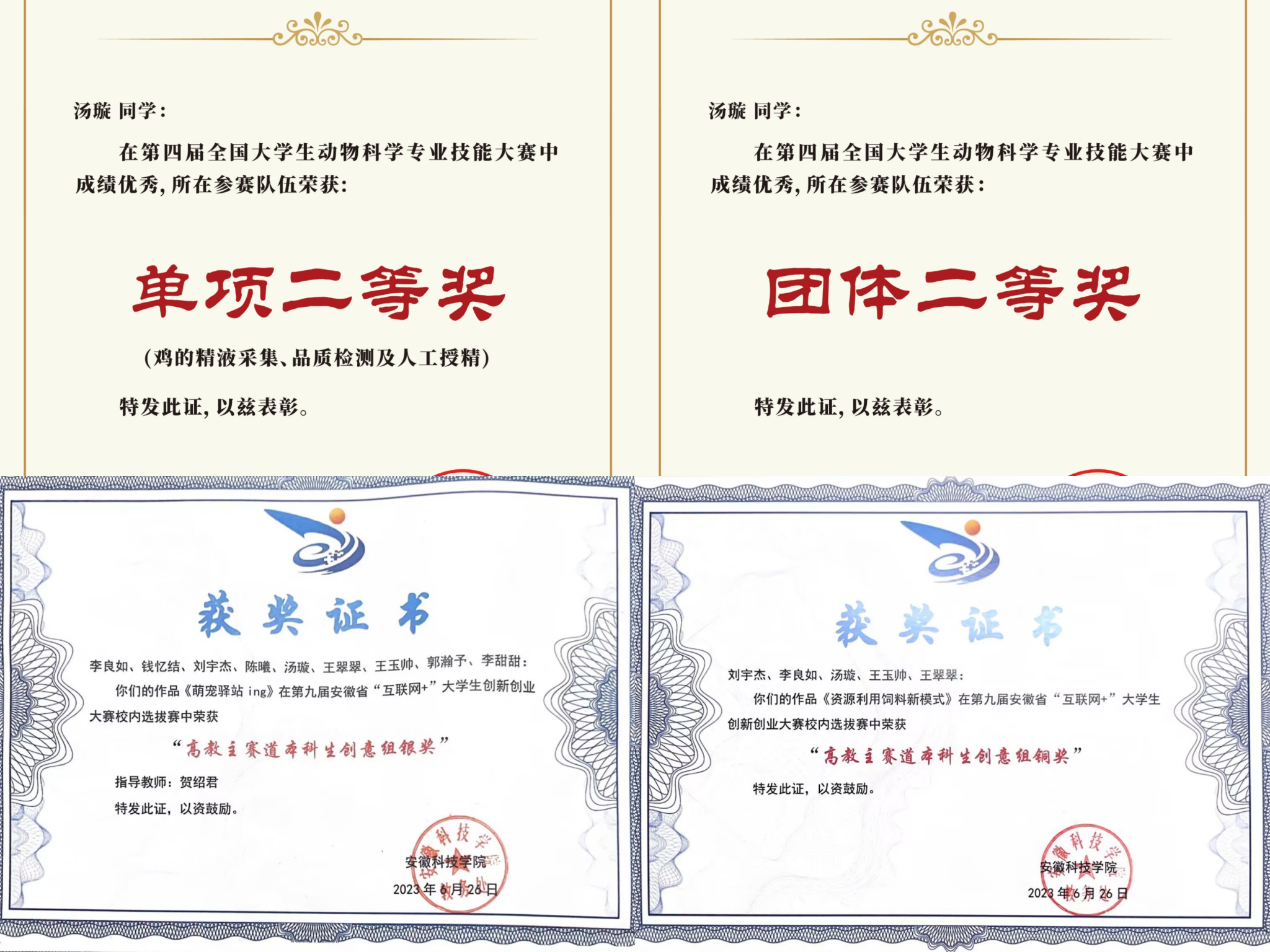 “比赛是检验学习成效的试金石”,她经常参加各项比赛,带着不怕失败、勇于试错的态度,大胆尝试,即便过程苦且累,但因热爱而充实。备赛“挑战杯”期间,汤璇一遍一遍地跟老师请教、练习,最终斩获第四届全国大学生动物科学专业技能大赛单项二等奖和团体二等奖。她参与的《萌宠驿站ing》和《资源利用饲料新模式》项目,在“挑战杯”创新创业大赛校内选拔赛中荣获银奖、铜奖,从专业实际出发,提高解决问题的能力,培养创新思维。