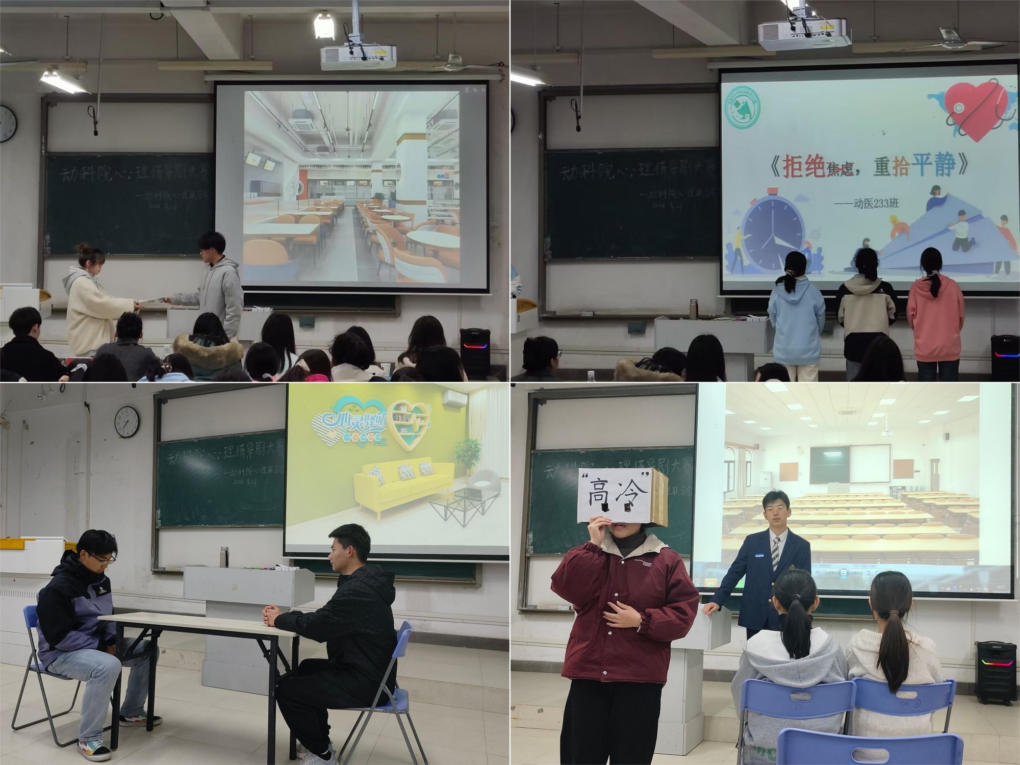 为深入推进学院学生心理教育工作,加强大学生心理健康教育,营造阳光健康的校园文化氛围。3月27日晚,动物科学学院在新知楼B座成功举办心理健康情景剧大赛。动物科学学院党政办副主任范雨梦、动物科学学院专职辅导员王永芳、机械工程学院专职辅导员蔡炜煜、动物科学学院心理联合会负责人郭琪、卢春辰应邀担任本次比赛的评委,本次比赛由动物科学学院艺体中心徐莹莹主持,学院心理负责老师范雨梦全程指导。