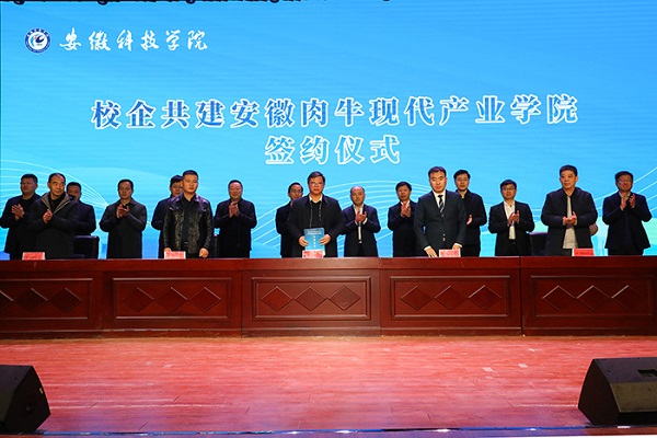 乐鱼平台_乐鱼(中国)一站式服务平台党委委员、副院长李升和代表学校与安徽欣浩翔食品有限公司、淮南市犇牛特畜牧养殖有限公司、安徽宝临食品有限公司、凤阳县大明农牧科技有限公司签署校企共建安徽肉牛现代产业学院协议。