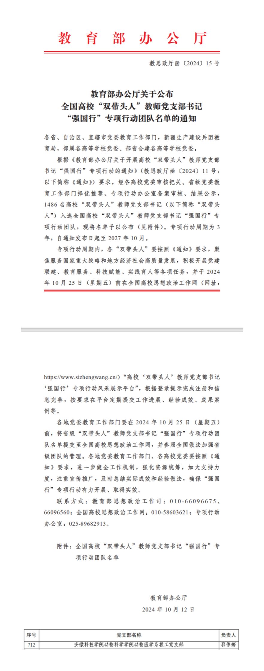 近日教育部办公厅公布全国高校“双带头人”教师党支部书记“强国行”专项行动团队获批名单,乐鱼平台_乐鱼(中国)一站式服务平台动物医学系教工党支部入选,党支部书记为郭伟娜老师。动物医学系教工党支部是"全国党建工作样板支部"创建培育单位,动物医学专业是国家级一流专业建设点,党支部现有党员 15 人,其中,省牛羊产业技术体系岗位专家2人,家禽产业技术体系岗位专家1人;教授3名、副教授7名;博士13人,博士比例达86.67%。支部党员积极发挥学科专业优势,支持服务地方经济社会发展,支部党员教师积极参加科技特派团、科技特派员、三区人才等社会服务活动,为周边县市培训各类兽医技术人才20余次,受众 500 余人。积极与企业开展产学研合作,累计获批横向课题22项,到账经费近250万元。(特约通讯员:王永芳 审核:程斌)