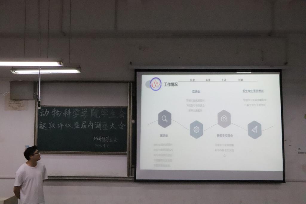 为推进动物科学学院学生会组织依法依章开展工作,加强学生会组织建设,9月1日下午,动物科学学院于求知楼A106教室召开学生会干部述职评议暨内部调整大会。学院党委副书记汤帅,团委书记李焱,学生会指导老师胡文丽,校学生会主席团成员刘名,18、19、20级学生代表出席此次会议。上一任学生会干部和现任学生会全体成员参加会议。会议由李子燕主持。