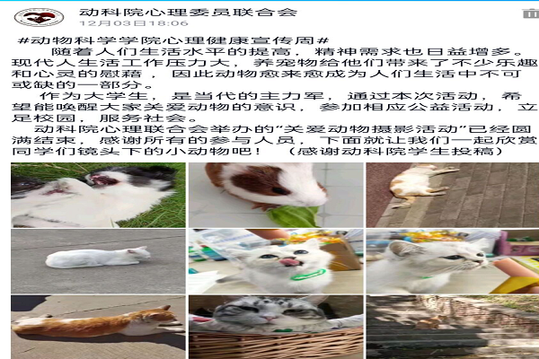 为广泛宣传心理健康知识,在全院营造关注心理健康、懂得心理健康、重视心理健康的浓厚氛围,12月上旬,动物科学学院举办了主题为“关爱动物,传递爱心,尊重生命”的“12·15”大学生心理健康月系列活动。