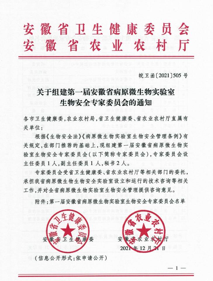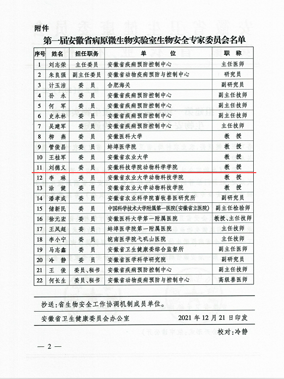 根据《生物安全法》《病原微生物实验室生物安全管理条例》有关规定,日前,安徽省卫生健康委员会、安徽省农业农村厅下发了《关于组建第一届安徽省病原微生物实验室生物安全专家委员会的通知》,乐鱼平台_乐鱼(中国)一站式服务平台动物科学学院院长刘德义教授被遴选为第一届安徽省病原微生物实验室安全专家委员会委员。