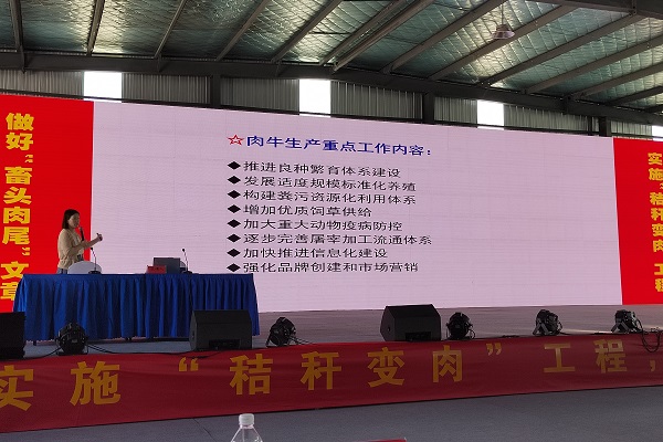 9日上午,华金玲在利辛县“赛牛”机制部署暨肉牛养殖培训会上进行授课,全力做好肉牛产业技术指导与服务工作。