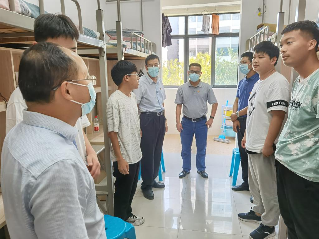 骆海邦一行人走进新生宿舍,仔细查看新生居住环境,耐心介绍学校情况,与新生亲切交谈,询问他们的家乡、家庭情况、专业以及入校感受等。骆海邦指出,新生来校后,要注意以下三点:一、遵守学校学院疫情防控要求,坚持晨午晚检制度,做到非必要不出校;二、尽快适应大学生活,遇到困难,主动寻求辅导员老师或导生等高年级学长学姐帮助;三、要尽快树立大学目标,制定学习生活计划,早日实现人生理想。