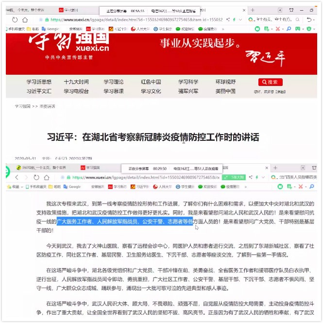会上,宋志华针对疫情防控期间支部党员的积极作为、志愿服务、主动捐款事迹进行了总结,肯定了党员在大学生群体中发挥的先锋模范作用。然后,宋志华带领全体党员学习了《习近平总书记在湖北省考察新冠肺炎疫情防控工作时的讲话》:习近平总书记赴湖北省武汉第一线考察疫情防控形势和工作进展,并看望慰问了湖北人民、武汉人民以及奋斗在抗疫一线的广大医务工作者、人民解放军指战员、公安干警等各方面人员,肯定了武汉人民在此次疫情中做出的重大贡献,分析了湖北和武汉当前的疫情形势并对防控工作做了进一步指导和部署。通过学习,支部党员表示,以习近平同志为核心的党中央把人民群众生命安全和身体健康放在第一位,对新冠肺炎疫情高度重视,采取了一系列硬核措施,才有效地遏制疫情蔓延势头,中国共产党真好。