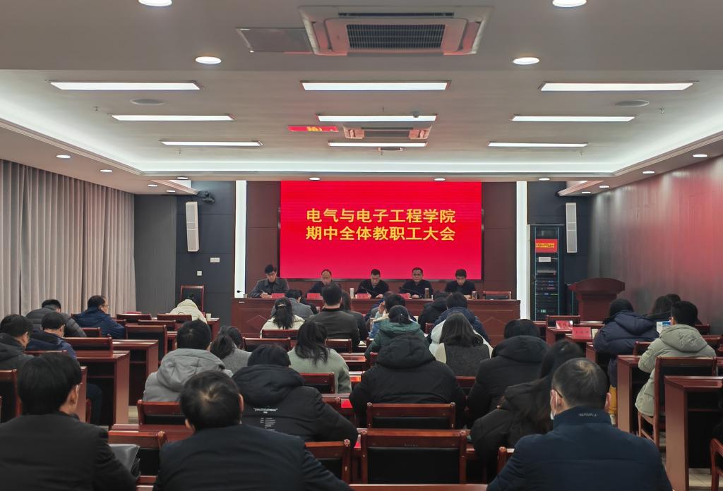 11月30日下午,电气与电子工程学院于西辅楼111报告厅召开本学期期中全体教职工会议,学院党委书记骆海邦,党委副书记、院长夏显明,党委副书记、纪委书记尚磊,副院长国海,副院长樊晓宇及全体教职工参加了会议,会议由骆海邦主持。