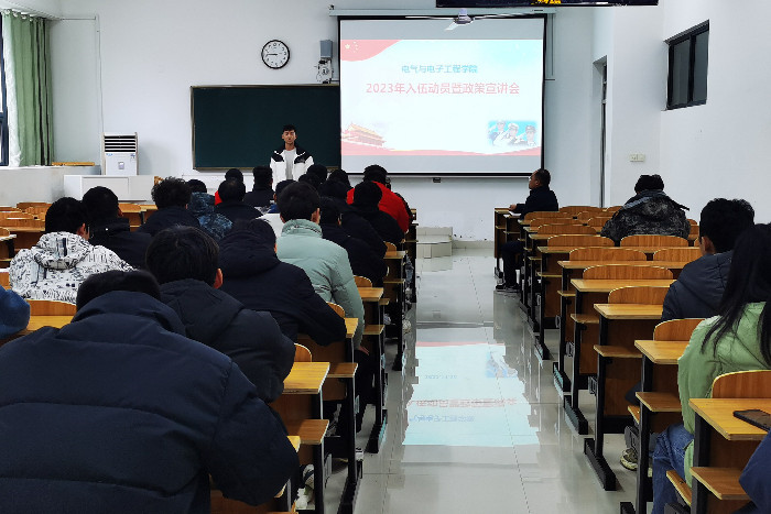 为做好学生应征入伍宣传动员工作,鼓励青年学生积极响应国家号召应征入伍,12月1日,电气与电子工程学院在致知楼B108举行“2023年入伍动员暨政策宣讲会”。学院党委副书记、纪委书记尚磊,党政办主任王延丽,团委书记张成孜,毕业班辅导员应邀出席,2019级部分毕业班学生参加了会议。