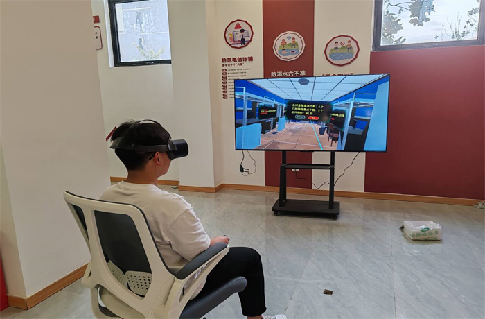 活动中,学生依次戴上VR眼镜来学习和体验消防应急及疏散基本常识。在模拟火灾逃生的VR体验中,他们不仅感受到了火灾爆发时的紧急氛围,也学会了如何正确使用消防器材、寻找逃生通道以及火灾逃生技巧,有效提高了学生们的消防安全意识和应急自救能力。