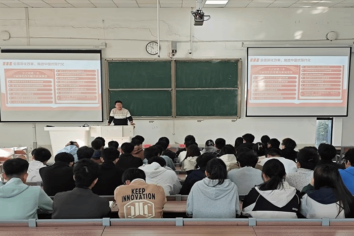 会上,张深结合党的二十届三中全会精神学习体会,深入阐释了进一步全面深化改革,推进中国式现代化的重大意义、指导原则、目标任务和重大举措,进一步全面深化改革的重要性、必要性。他以“人民工匠”许振超与“人民科学家”赵忠贤的事迹为例,指出面对进一步全面深化改革的各项任务,广大青年人生逢其时,重任在肩,应时刻牢记自身职责所在,勇敢担当起时代赋予的责任使命,在强国建设、民族复兴中勇当先锋队;不断提升自身素质,努力成长为具有高度社会责任感和富有实践能力的复合型“新工科人才”。