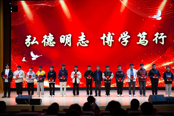 第一篇章《弘德明志,博学笃行》,由主持人宣布第三届“电创未来”文化节科创比赛类、学科竞赛类、艺术赛事类、学党史、体育赛事类活动获奖学生名单,学院领导班子上台为获奖同学颁奖并合影留念。