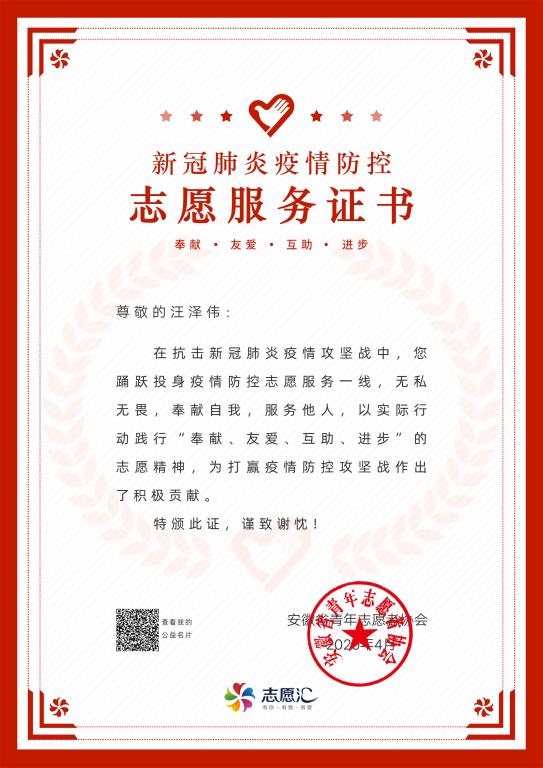 2020年1月下旬开始,新型冠状病毒在中华大地上肆虐。无数青年学子主动请缨,成为家乡疫情防控的“战斗员”,汪泽伟奋不顾身的投入了此项工作中。他及时联系同学朋友,多方打听救助方法,最后了解到相比较金钱,其实一线对于专用防护用具的需求更加迫切。于是,他便联系在日韩留学的朋友,经过不懈努力,汪泽伟找到了在日本的一位朋友,帮忙从日本代购了多套专业的医护用具,更是通过朋友介绍,联系到华中科技大学同济医学院协和医院的吕主任,完成了捐赠。疫情期间,他们前前后后一共帮助到了6家医院。
