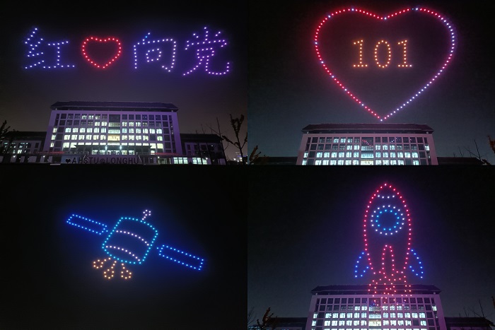 仰望星空所见并非只是繁星点点,也有着对科学探索、遨游太空、飞天梦想的美好向往和热爱。活动过程中,在专业技术人员的操控下四百余架无人机缓缓升起,它们排列整齐、群灯闪烁、蓄势待发。无人机起飞至距离地面六十米的高空,依次进行组图展示,“红心向党、建党101周年、卫星翱翔、飞天火箭、月球车、创新之城、幸福蚌埠”等十余幅动图映入观众眼帘。现场的师生掌声阵阵,激动与震撼在内心并存,伴随着欢呼和呐喊声,展演结束。
