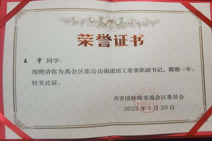 信中指出,王宇同学作为蚌埠籍大学生,能够主动请缨,积极响应号召,在家乡街道任职,在实践中锻炼自我,荣膺担当;思想开路,实干架桥,践行新时代大学生的理想与担当,能够在平日工作里以谦逊平和、踏实肯干的态度去了解群众,运用所学所思去帮助解决居民群众的实际问题,充分展现了乐鱼平台_乐鱼(中国)一站式服务平台学子的奕奕风采。