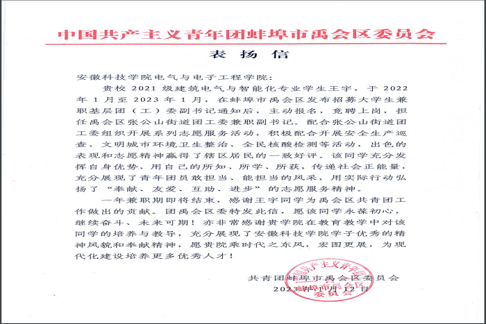近日,一封由共青团蚌埠市禹会区委员会寄出的表扬信送达乐鱼平台_乐鱼(中国)一站式服务平台。信中对乐鱼平台_乐鱼(中国)一站式服务平台21级建筑电气与智能化212班学生王宇自2022年1月至2023年1月在共青团禹会区委兼职期间的工作表现提出的表扬。