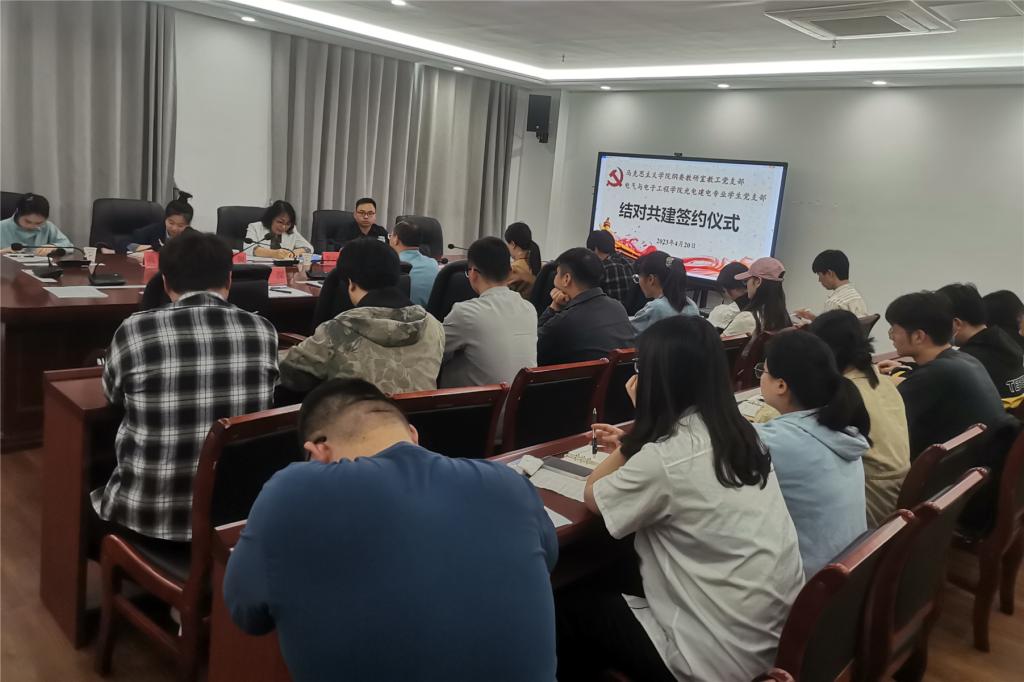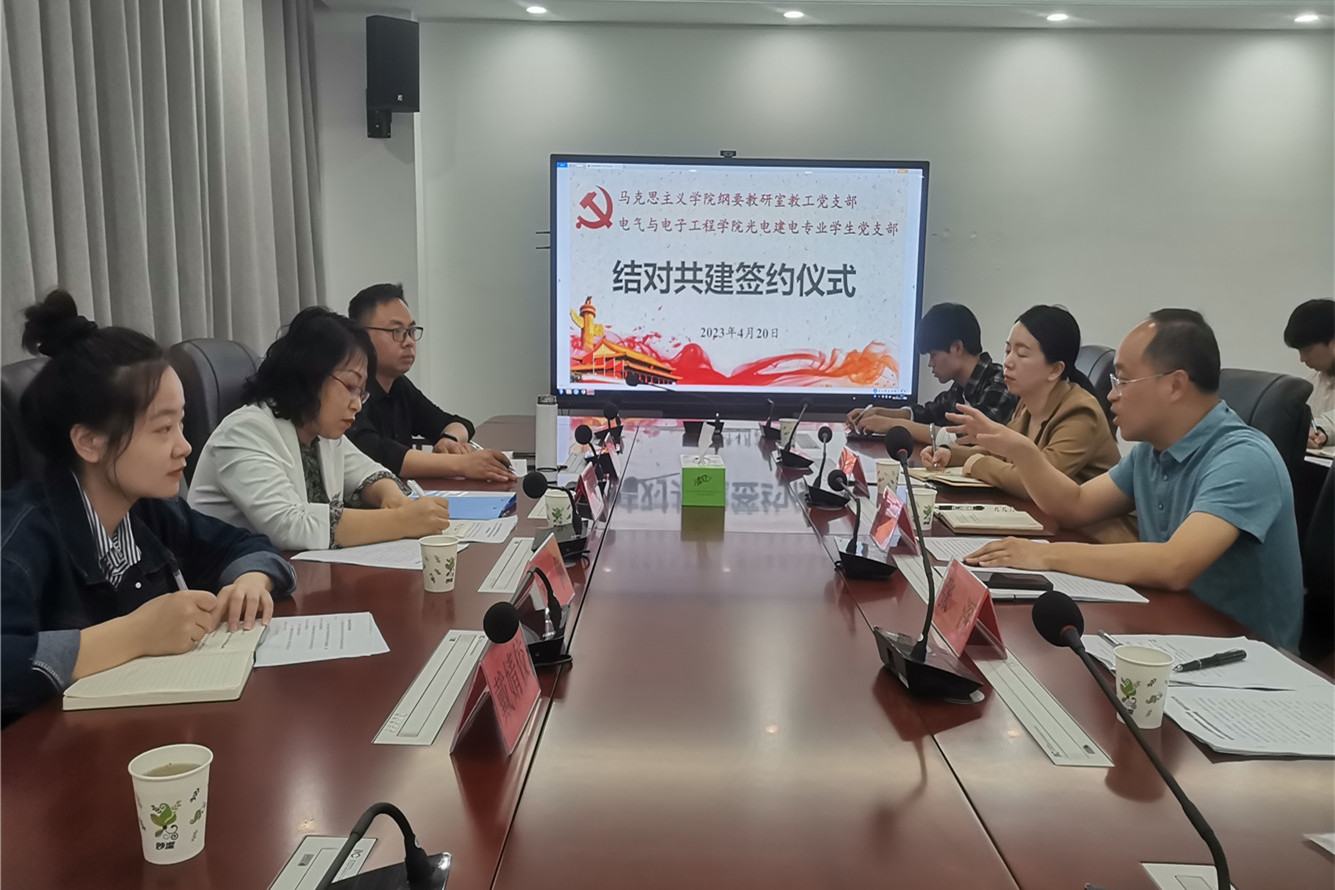 为进一步推动党建工作提质增效,形成“共建组织、共抓队伍、共享资源、共谋发展”的党建工作新格局,4月20日,电气与电子工程学院光电建电专业学生党支部与马克思主义学院纲要教研室教工党支部开展结对共建签约活动。电气与电子工程学院党委副书记、纪委书记尚磊,党政办公室主任王延丽,马克思主义学院纲要教研室教工党支部书记、纲要教研室主任李红艳,纪检委员黄钦海,宣传委员戴佩,教工党员戴婧佼以及光电建电专业学生党支部学生党员代表出席了结对共建签约活动。活动由光电建电专业学生党支部书记张深主持。