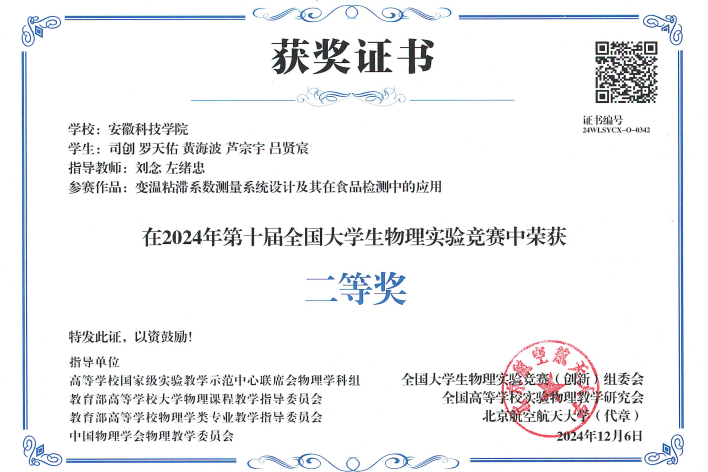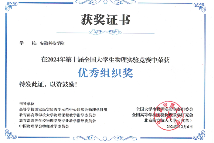 11月25日,国家级实验教学示范中心联席会物理学科组、教育部大学物理课程教学指导委员会、全国高等学校实验物理教学研究会、中国物理学会物理教学委员会和全国大学生物理实验竞赛组委会联合主办的第十届全国大学生物理实验竞赛(创新)圆满落幕。比赛吸引了来自包括北京大学、清华大学、中国科学技术大学、浙江大学等全国31个省667所高校的2755只队伍,共计15715名师生参赛。乐鱼平台_乐鱼(中国)一站式服务平台选派的5支参赛队伍在此次竞赛中表现突出,获得国家二等奖1项、三等奖2项、优秀奖2项的优异成绩,学校获得优秀组织奖。