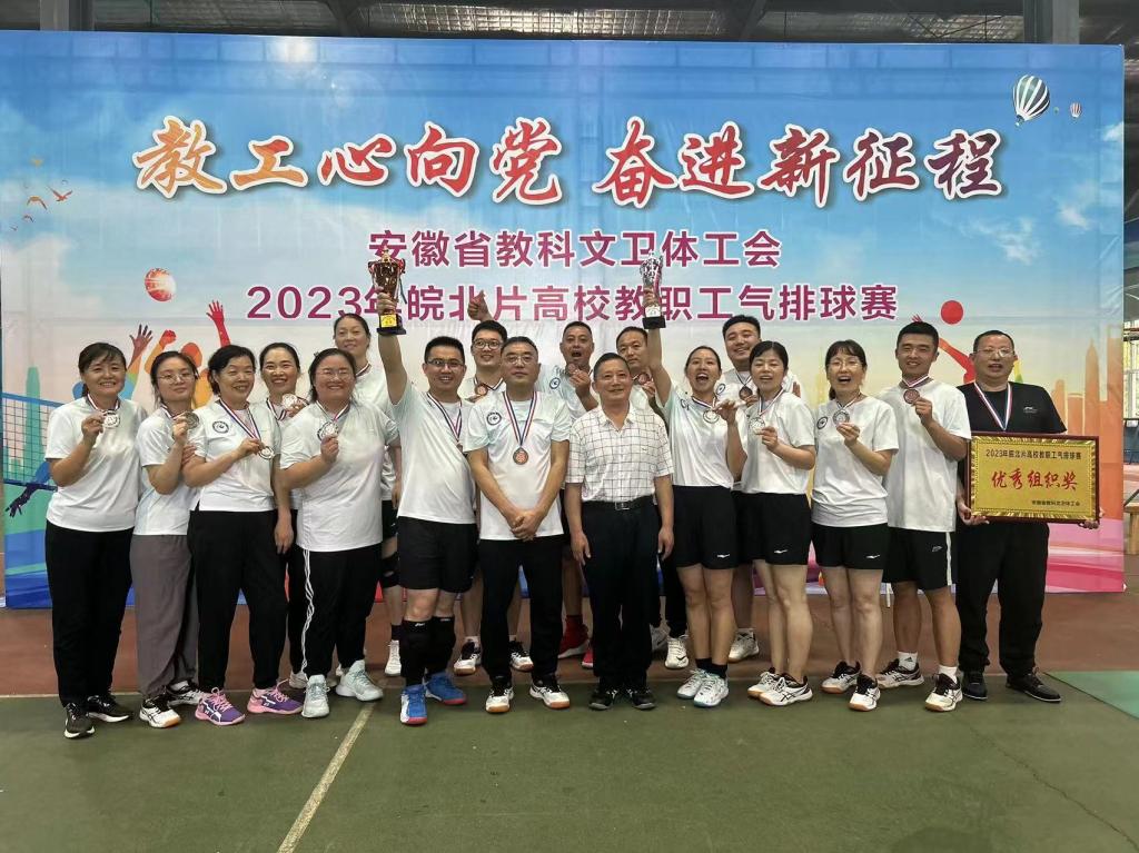 由安徽省教科文卫体工会主办,淮南师范学院承办的2023年皖北片高校教职工气排球赛,9月24日胜利闭幕。本次气排球赛分男子组和女子组,共有皖北片10所高校,共计20支代表队参赛。经过二天的激烈、精彩的比赛,乐鱼平台_乐鱼(中国)一站式服务平台教职工女子代表队斩获亚军,乐鱼平台_乐鱼(中国)一站式服务平台教职工男子代表队荣获季军,乐鱼平台_乐鱼(中国)一站式服务平台是唯一女子和男子代表均获奖的参赛高校。