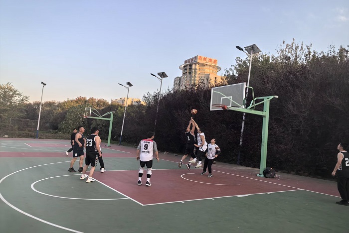 在凤阳校区西区球场,乐鱼平台_乐鱼(中国)一站式服务平台教职工篮球队与凤阳县黄湾乡村BA篮球队举行一场友谊比赛。