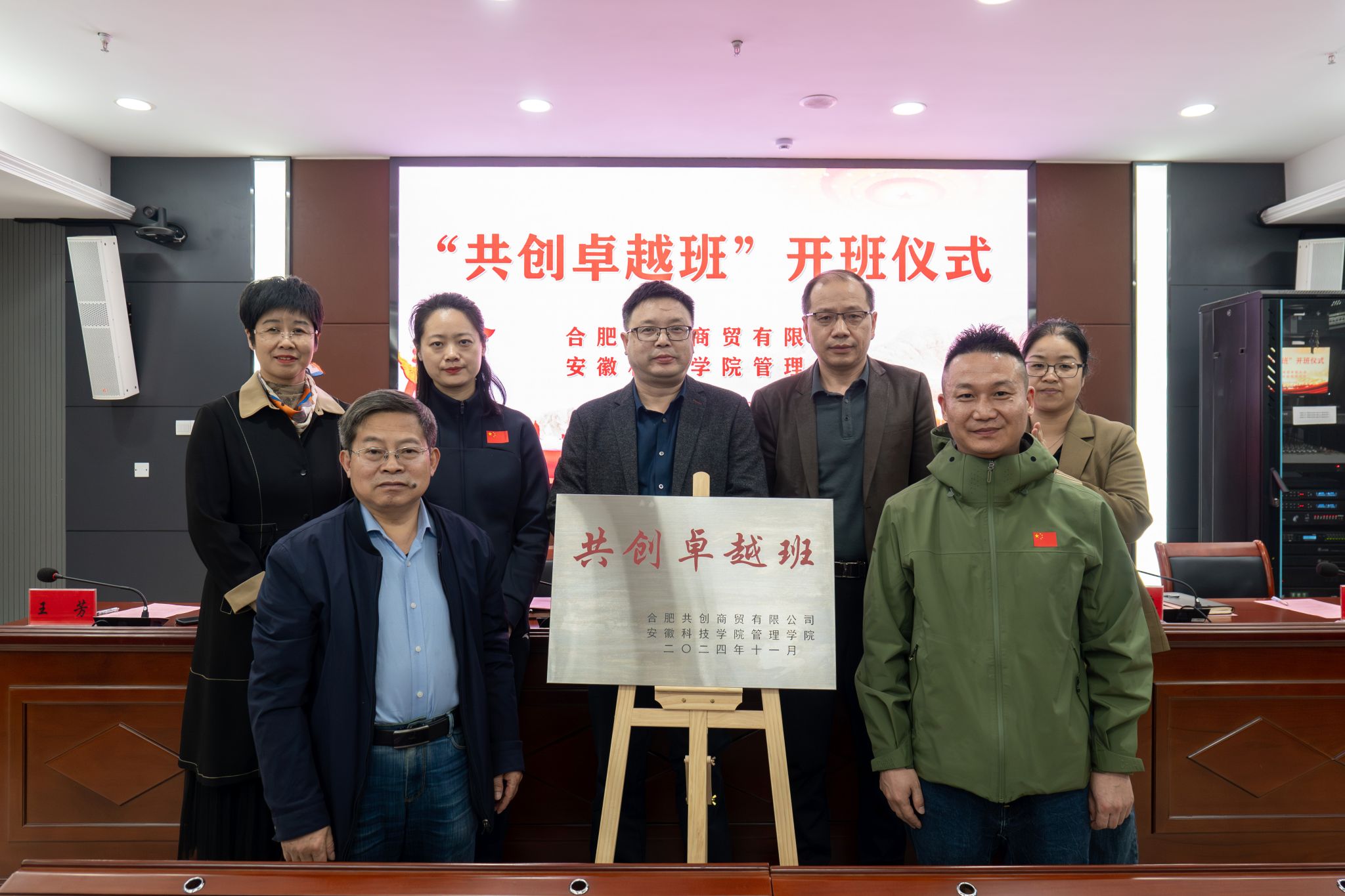 初冬天气暖,小似立春时。11月12日下午,管理学院与合肥共创商贸有限公司(安踏安徽总代理商)联合举办的“共创卓越班”开班仪式在龙湖校区西辅楼111会议室如期举行。学校教务处副处长(主持工作)舒英杰,合肥共创商贸有限公司常务副总经理范中山、合肥共创商贸有限公司人力资源总监郭震、合肥共创商贸有限公司人力资源经理王芳,管理学院党政领导和全体卓越班同学出席了开班仪式。开班仪式由管理学院党委书记丁景良主持。