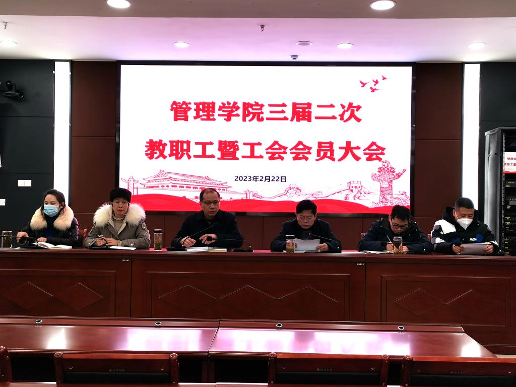 2月22日下午,管理学院在西附楼111会议室召开管理学院三届二次教职工暨工会会员大会。学院党政领导和全体教职工参加了会议。会议由院党委书记丁景良主持。