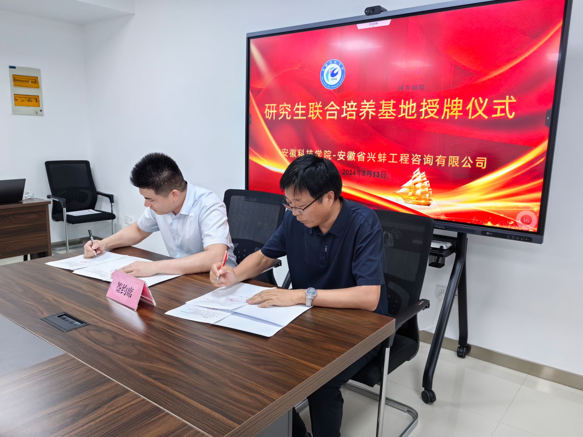 为进一步推动校企产学研用深度融合,推进研究生实习基地建设,8月13日上午,校研究生处处长张春雨,校招生与就业工作处副处长(主持工作)何晓冬,管理学院党委书记丁景良、副院长郑谦等一行5人赴安徽省兴蚌工程咨询有限公司签订校企产学研合作协议,共商研究生联合培养基地建设,受到蚌埠市城市投资控股集团党委书记、董事长沈明仕,公司党委委员、副总经理邓新东及该公司子公司兴蚌工程咨询有限公司领导等的热情接待。座谈签约仪式由丁景良主持。