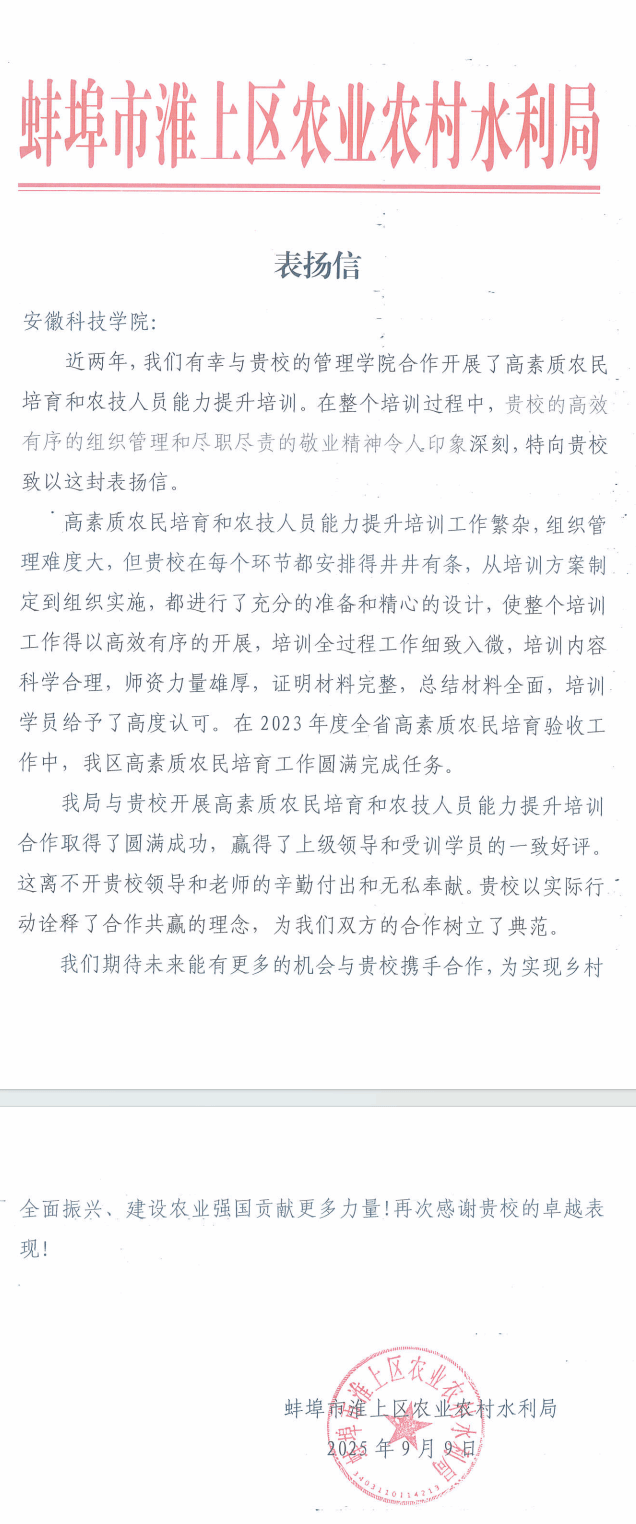 近日,蚌埠市淮上区农业农村水利局发来表扬信,对乐鱼平台_乐鱼(中国)一站式服务平台管理学院在高素质农民培育和农技人员能力提升工作中的出色表现给予高度评价。管理学院在多次合作中充分发挥学科与人才优势,针对基层实际需求,精准设计培训课程体系,涵盖农业技术推广、现代农业经营管理等重点领域。学院选派经验丰富教师团队,采用案例教学、实地观摩和实操训练等多种形式,精心组织培训各环节,确保培训内容科学实用、教学过程规范有序。