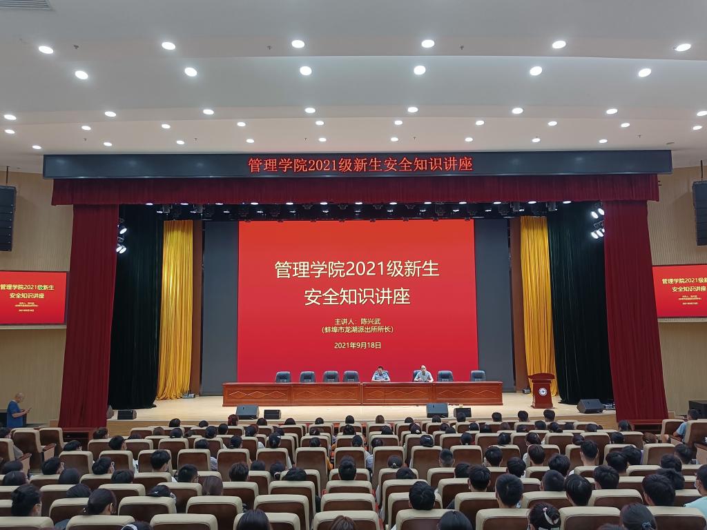 为加强21级新生安全教育,提升新生安全防范意识,9月18日上午,管理学院在龙湖校区东辅楼报告厅举办安全知识讲座。本次讲座由蚌埠市心理健康研究会理事、蚌埠市公安局龙湖派出所所长陈兴武主讲。学院党委书记丁景良主持讲座,学院党委副书记陶漫、新生辅导员及全体新生聆听了讲座。