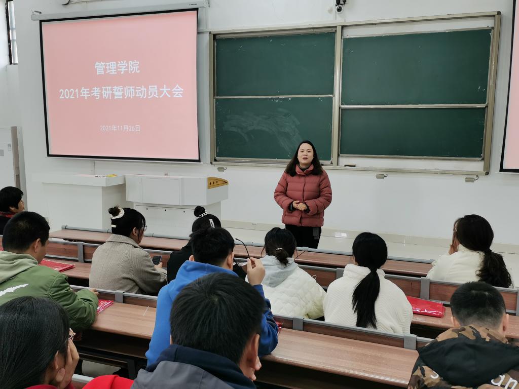 在全国硕士研究生招生考试最后30天关头,为进一步坚定学生考研信心,对2021年考研学子再动员、再鼓劲、再慰问,11月26日上午,管理学院在致知楼B111教室举行2021年考研誓师大会。学院党委副书记、纪委书记陶漫,副院长郑谦,团委副书记方辛、江旭聪出席会议并为考研学生送上祝福。