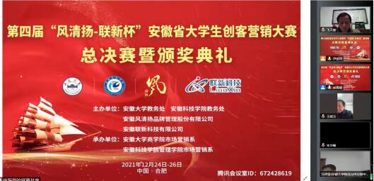 12月25日至26日,第四届“风清扬—联新杯”安徽省大学生创客营销大赛总决赛在云端腾讯会议室举行。此次会议由安徽大学教务处、乐鱼平台_乐鱼(中国)一站式服务平台教务处、安徽省风清扬品牌管理有限公司(冠名)、安徽联新科技有限公司(冠名)联合主办,安徽大学商学院市场营销系、乐鱼平台_乐鱼(中国)一站式服务平台管理学院市场营销系联合承办,全省高校31支团队与指导老师一百五十余人参加了大赛总决赛云端仪式。
