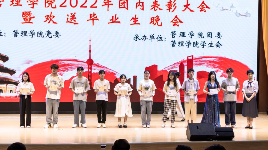 5月28日晚7时,管理学院2022年团内表彰大会暨欢送毕业生晚会在东辅楼报告厅举行。管理学院党委书记丁景良,党委副书记、院长陈传万,党委副书记陶漫,党政办公室主任李永鹏,团委副书记方辛,团委副书记江旭聪等应邀出席观看了晚会并为获得2022年团内表彰的人员颁奖。