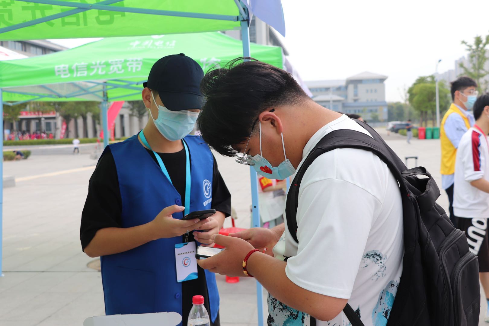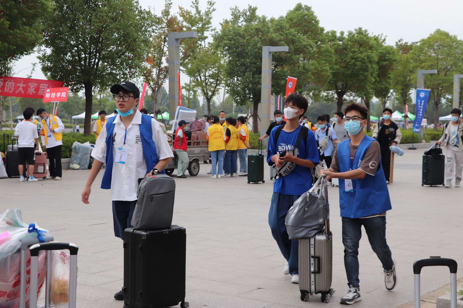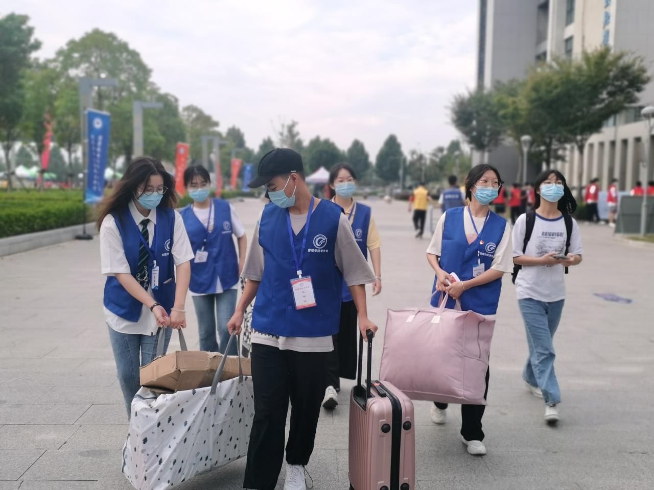 身着蓝色志愿者服装的学长学姐们接过新生手中的行李,背着大包小包带着新同学前往入学信息核验点。