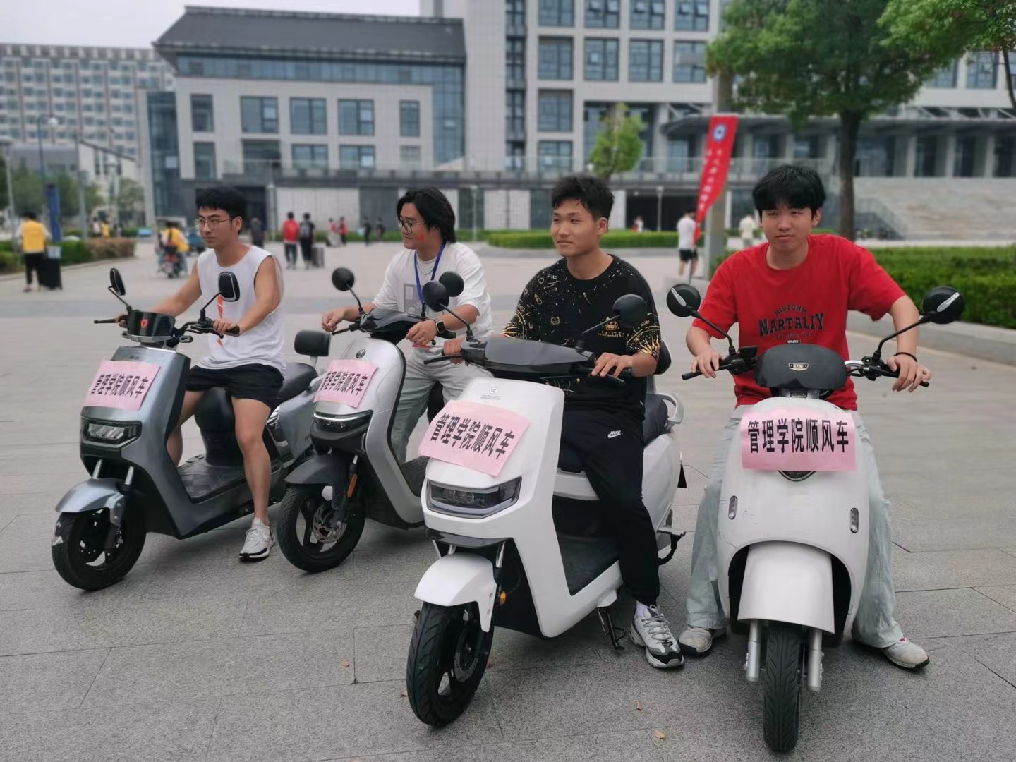 报到高峰期,管理学院的志愿者们还自发骑来电动车,往返接送新生。一路上,不时流动着“管理学院顺风车”的身影。