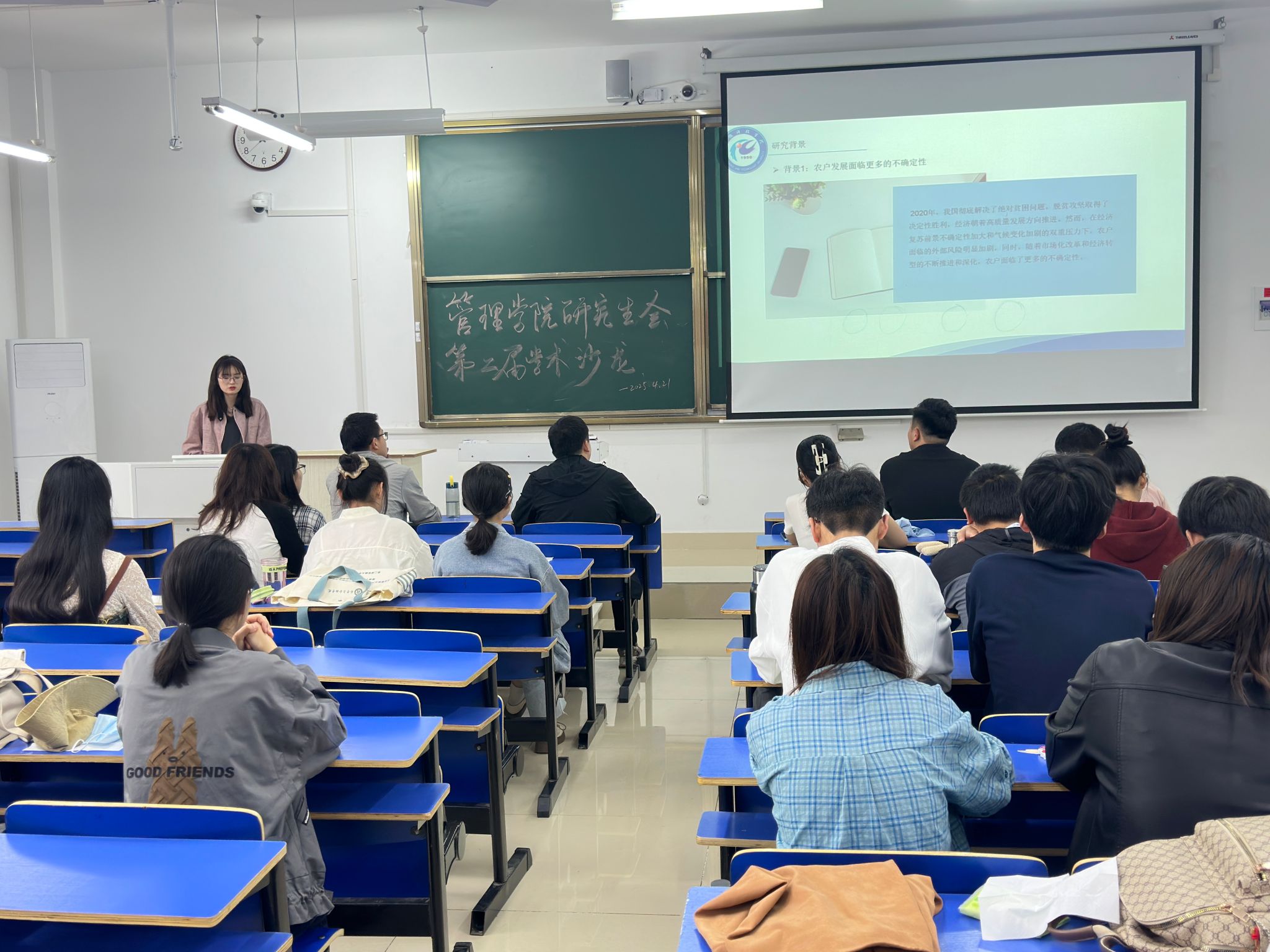 为激发研究生学术热情,营造浓厚的校园学术研究氛围,管理学院于4月21日上午在尚行楼C207开展管理学院研究生会第二届第一期研究生学术沙龙活动。本期学术沙龙报告会,邀请农业管理专业2023级李治云、王子微同学分享科研经验和技巧,农业管理领域2024级全体在校研究生参加。